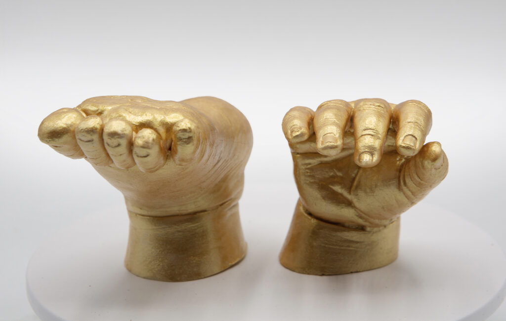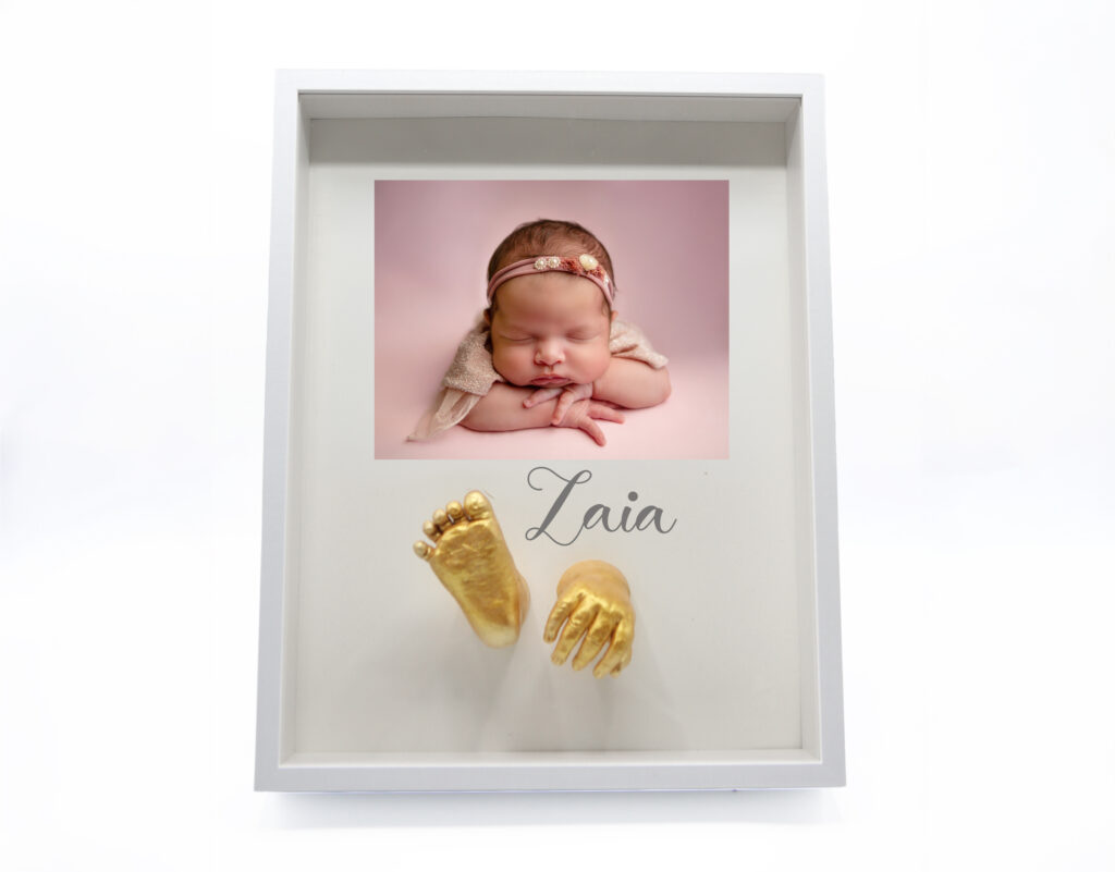 Your baby’s tiny hand and foot beautifully cast and preserved, alongside your